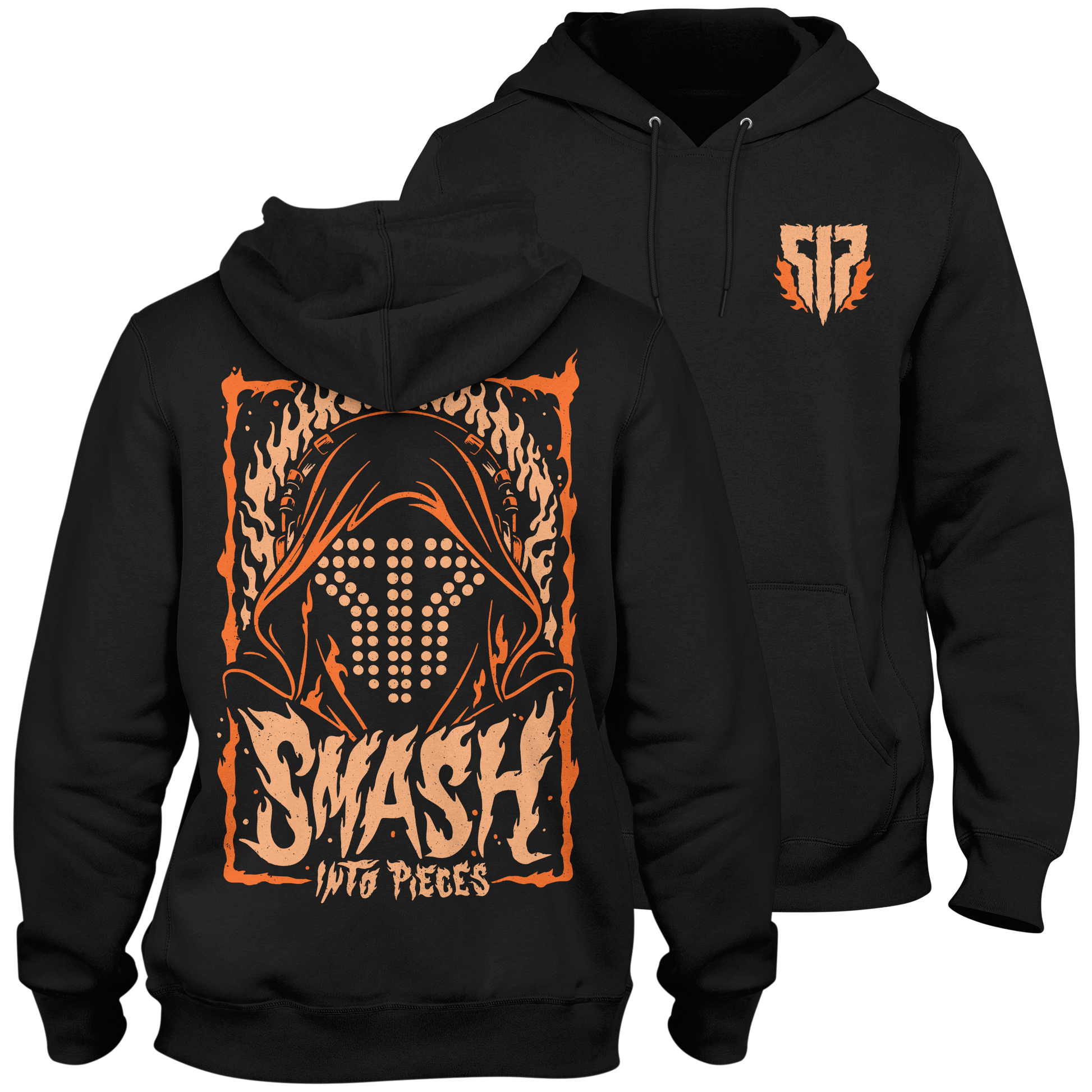 Turn up the heat with the Armaheaven Flame Hoodie. This black hoodie features a clean SIP emblem on the chest and a bold, full-size back print with the iconic hooded Apoc figure surrounded by intense orange flames and the classic Smash Into Pieces logo.